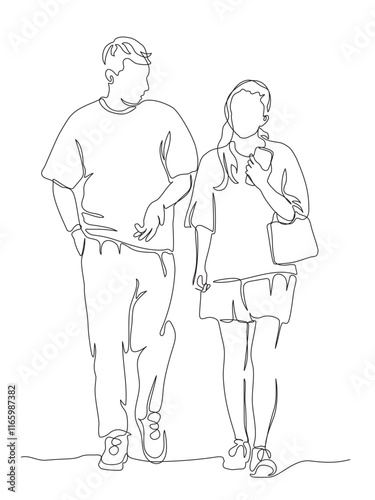 Man and woman talking. Couple walking. Woman holding phone. Continuous line drawing. Black and white vector illustration in line art style.