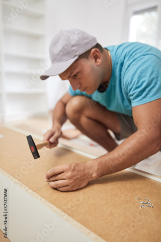 Man assembling furniture in new apartment, moving in and being hardworking.