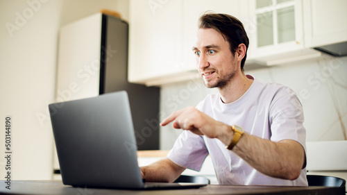 Man at laptop at home workplace chooses the point of destination for trip or working at home, studding on online courses with internet.