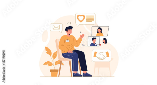 Man Attending Virtual Meeting Surrounded by Communication Icons and Plant