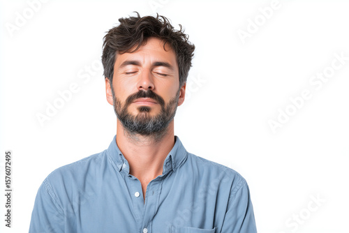 Man beard closed eyes calm meditation portrait adult casual shirt facial hair relaxation peaceful male thoughtful serene isolated white background contemplation adult male facial expression person