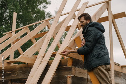 Man building wooden house
