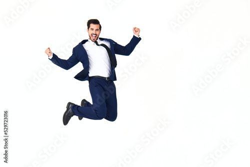 Man business smile with teeth in costume running and jumping flying up open mouth happiness and surprise full-length on white isolated background copy space