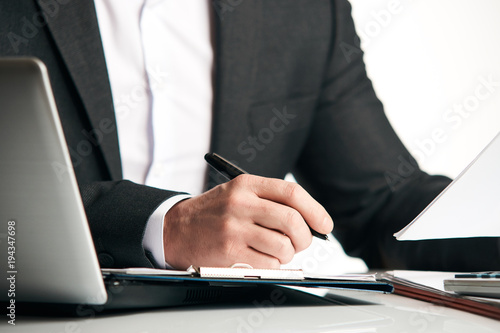 Man businessman signs documents with a pen making the signature sitting at the desk in his office over white background, close-up.