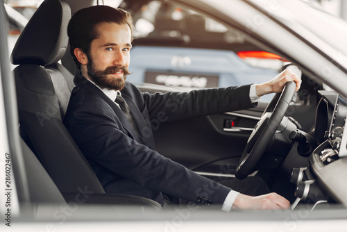 Man buying the car. Businessman in a car salon