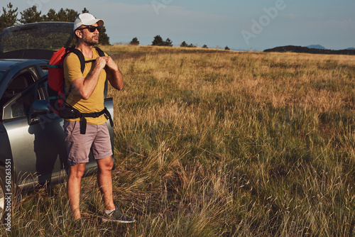 Man camping and hiking in nature, unpacking from car outdoors, recreation and hobbies.