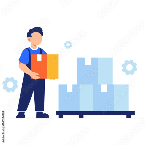 Man Carrying Orange Box in Warehouse with Blue Overalls and Transparent Background