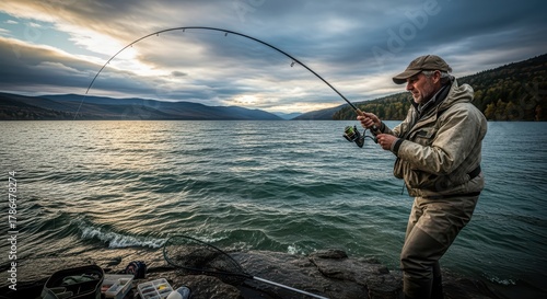 Man casts fishing rod into calm lake water, enjoying sport fishing and peaceful outdoor leisure in a scenic natural environment.