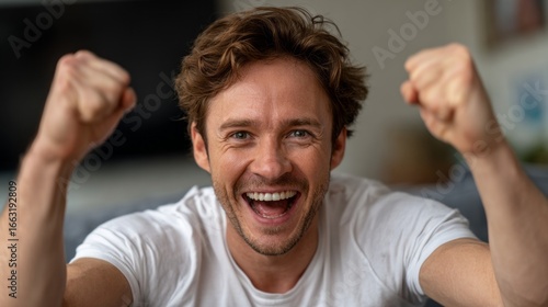 Man celebrates a thrilling football match while watching at home on a cozy living room couch