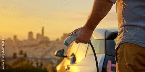 Man Charging Electric Vehicle During Sunset in Urban Landscape, Sustainable Transport. copy space