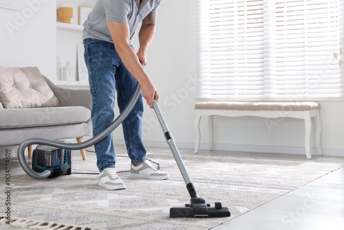 Man cleaning carpet with vacuum cleaner at home, closeup