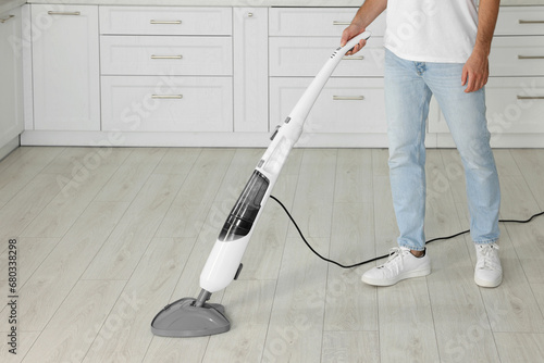 Man cleaning floor with steam mop at home, closeup