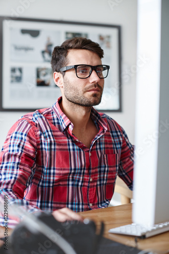 Man, computer and email client in office, creative professional and event coordinator online. Male person, planner and business communication in workplace, reading proposal and working for party