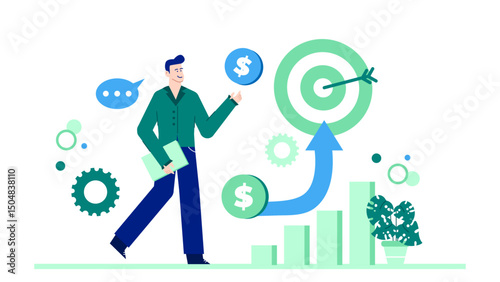 Man confidently walks towards a target and plant outdoors. Ideal for motivating concepts, success strategies, and personal growth themes.
