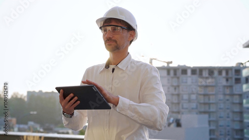 Man construction engineer or architect wearing white shirt and hard hat is using digital tablet while inspecting a building site at sunset, front view. Architecture and engineering concepts