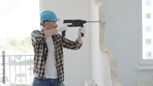 Man construction worker demolishing a wall with a hammer drill in protective gear, creating construction debris on the surrounding floor surface. Renovation concept