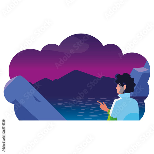 man contemplating horizon in lake and mountains at night scene