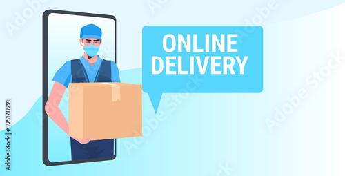 man courier in mask holding cardboard box black friday sale express delivery online service concept portrait horizontal vector illustration