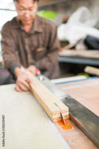 Man Cutting Wood on Table Saw