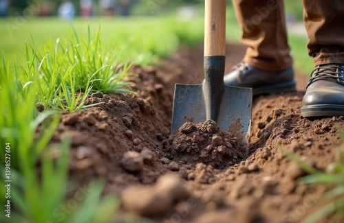 Man digs soil with shovel. Close-up of legs, dirt details, fresh green lawn grass. Gardening, landscaping work, spring or summer season, backyard, park. Outdoor activity. Gardening service.