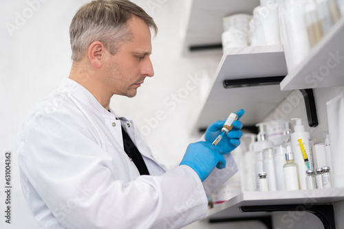 man doctor, cosmetologist holds a syringe with medicine in his hands