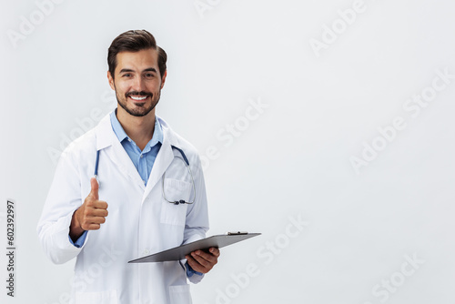 Man doctor in white coat with stethoscope and folder for notes and patient records smile and good test results on white isolated background, copy space, space for text, health