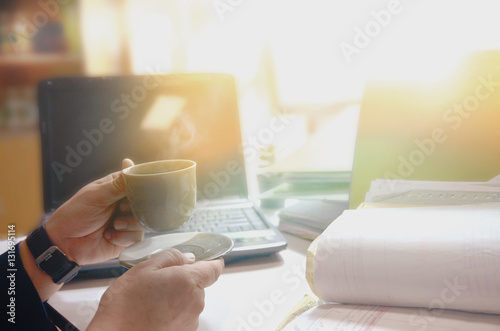 man drinking hot coffee in office workplace