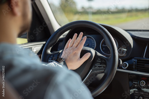 Man driving a car with hand on horn button.