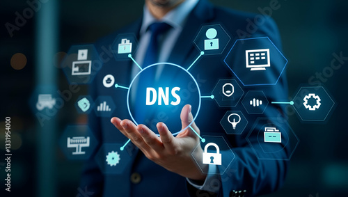 Man Engaging with DNS Interface: Icons Illustrating Internet Connectivity, Data Security, Website Management, and Server Operations - Highlighting DNS Importance in Stock Photo Concept
