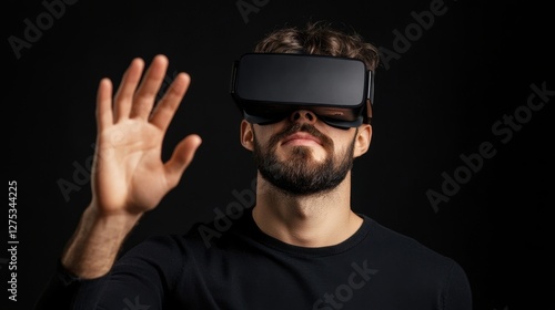 Man Engaging with Virtual Reality Technology, Wearing VR Headset, Isolated on Dark Background, Immersive Experience Concept