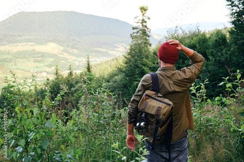 Man enjoy scenics view on valley. Hiking journey on tourist trail. Outdoor adventure. Beautiful nature landscape in mountains. Travel and exploration. Healthy lifestyle, leisure activities