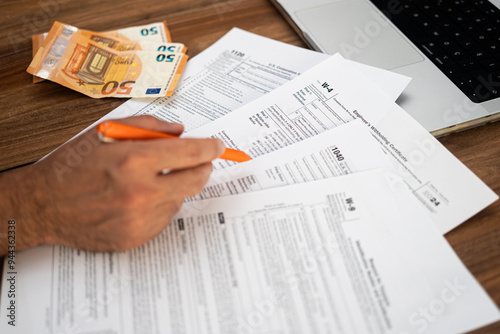 Man entrepreneur engages in paperwork filling complicated tax forms mandatory for business owners sitting at workplace with euro banknotes and laptop in office