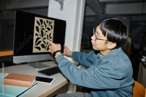 Man examining intricate leaf design on desktop computer screen in office environment, surrounded by book and smartphone