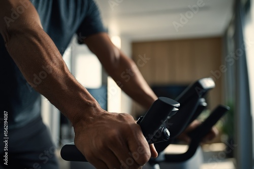 Man exercising on stationary bike indoors during day in modern fitness studio