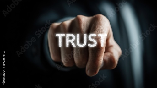 Man extending his fist towards the viewer with the word Trust written on it, symbolizing the importance of building relationships based on reliability and honesty