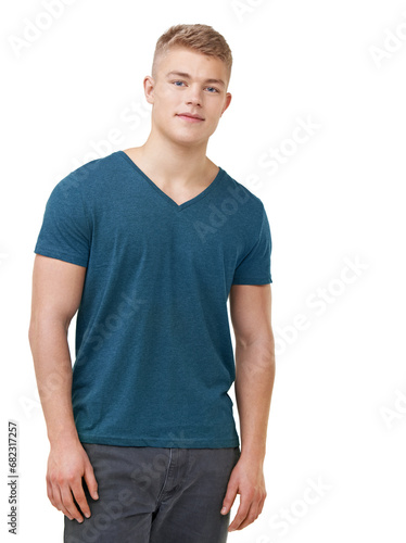 Man, fashion and cool clothes with denim jeans, happy and isolated on white studio background. Portrait, confident and adolescent for trendy outfit, youth and smile with face, boy and casual