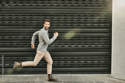 Man, fashion and running with confidence outdoor on casual, style and elegant for office or job. Clothes, lens flare and smile for dreams or career opportunity, offer and ambition in New York