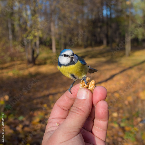 man feeding bluetit