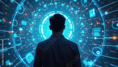 Man gazes at glowing futuristic interface of digital network. Abstract data stream with cyber symbols surrounds him. Represents online learning, internet marketing, virtual reality.