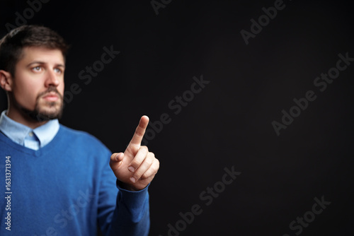 Man gestures with finger raised while expressing a point in a dark studio setting