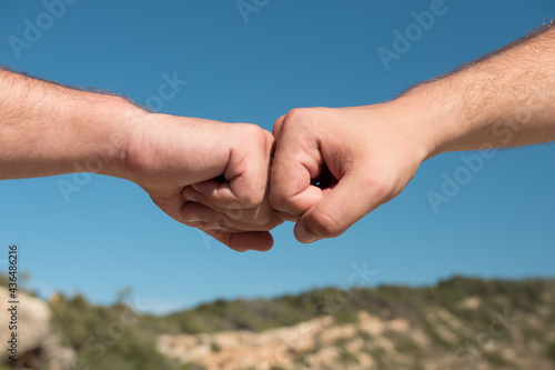 Man giving fist bump in the mountain with sky in the background. Brotherhood concept.