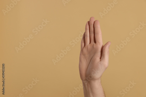 Man giving high five on beige background, closeup of hand. Space for text
