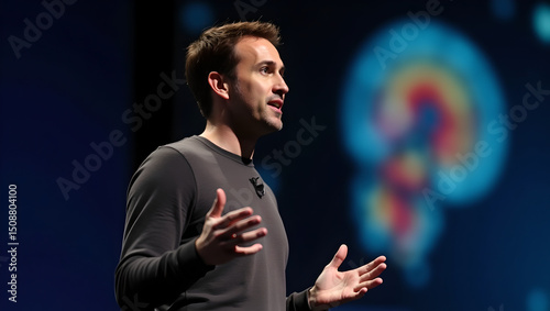 Man Giving Presentation on Stage with Brain Image Background