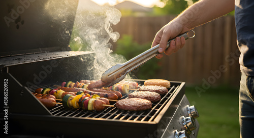 Man Grilling Sausages and Skewers on Gas Grill in Backyard During Sunset