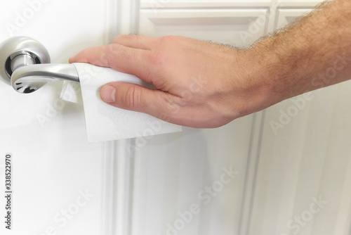 Man hand cleaning desinfected metallic door handle door knob