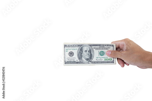 Man hand holding 100 US dollar banknote isolated on white background. Business and financial concept.