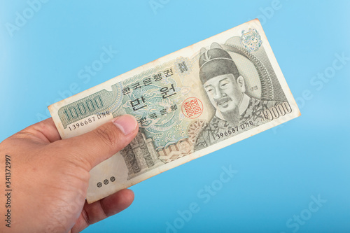 Man hand holding 10,000 won South Korean Bills with blue background.