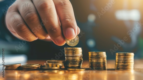 Man hand holding coin on wood table. Save money and financial investment and saving money for buying house, financial plan home loan concept.