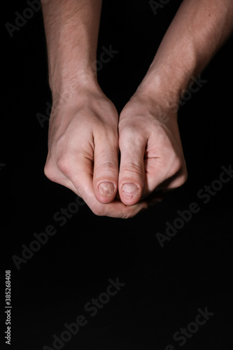 Man hand nail damage. Bitten nails. nail care. Men manicure. Nail plate problems. Man hands . Isolated on a black background.