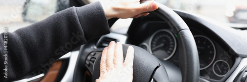 Man hand presses horn on steering wheel of car